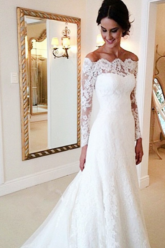 Off Shoulder Long Sleeve Ivory Lace Wedding Dress Promfy