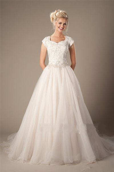 Champagne Lace Tulle Modest Wedding Dresses With Cap Sleeves