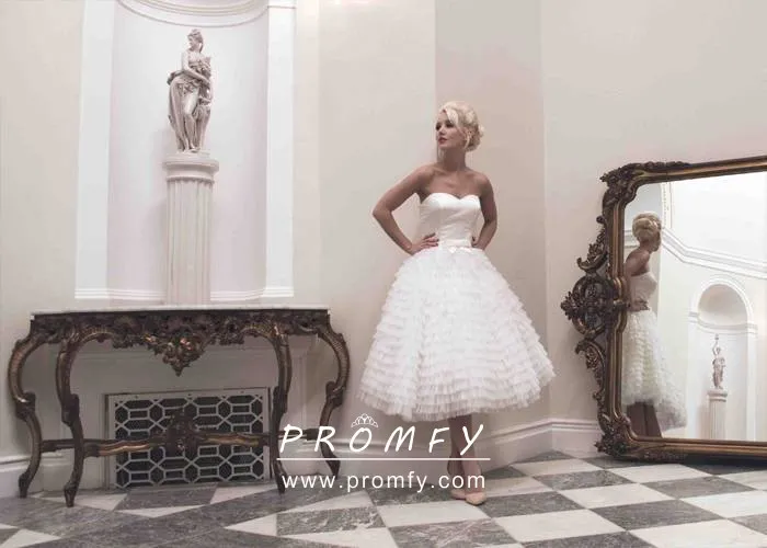 Tiered Ruffle Tulle Satin Tea Length Wedding Gown Promfy