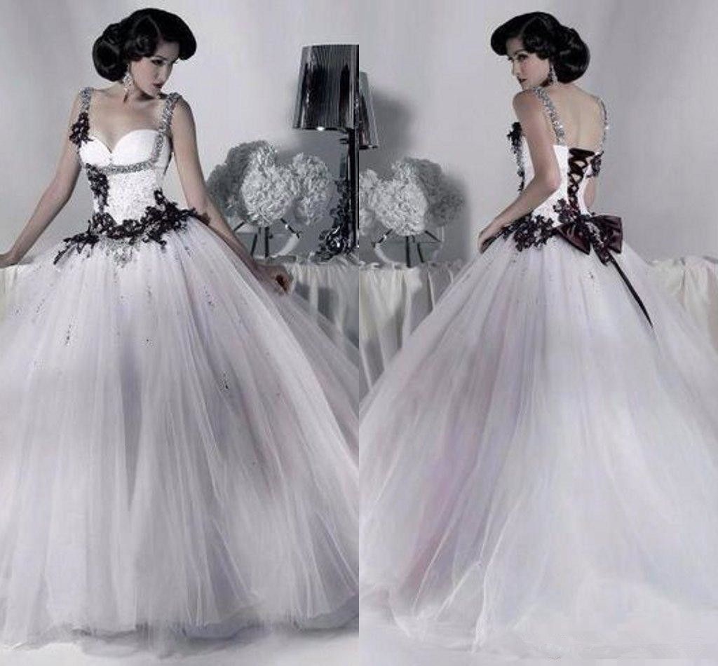 Discount White And Black Tulle Wedding Dresses Beaded Spaghetti