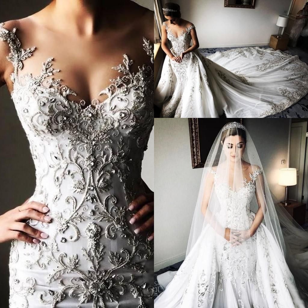 Luxury Beaded Lace Arabic Wedding Dresses With Detachable Train