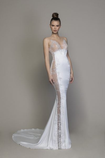 A girly sheath wedding gown style with a sheer slip to show off your sexy wedding ready legs.