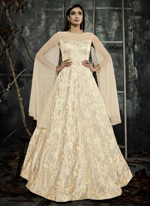 Buy Cream Jacqaurd Wedding Wear Printed Work Gown Online