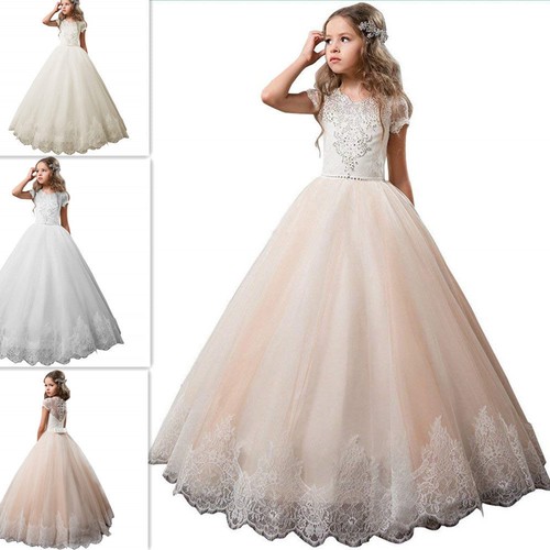 Bead Flower Girl Dress Short Sleeve Lace Ball Gown Kids Bridesmaid