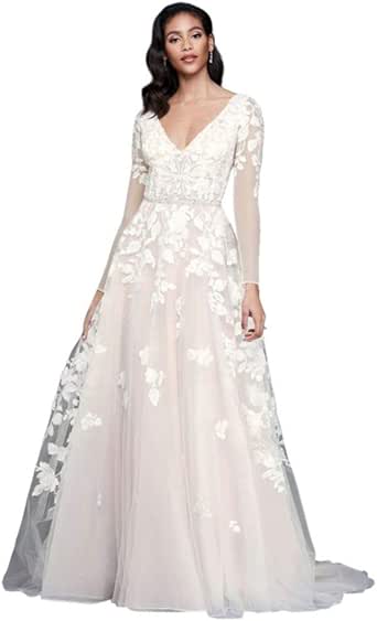David S Bridal Illusion Sleeve Plunging Ball Gown Wedding Dress