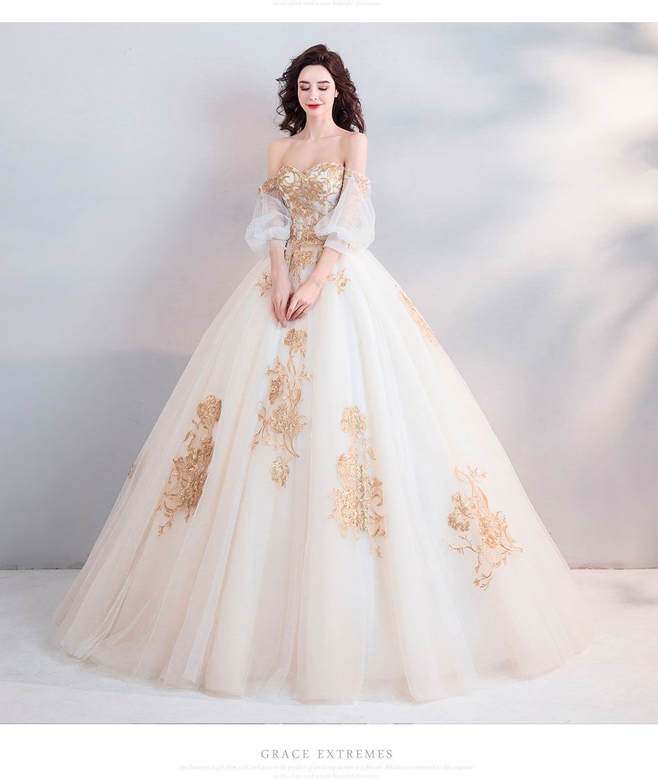 2019 New Gold Lace Ball Gown Wedding Dress Short Sleeves Off The