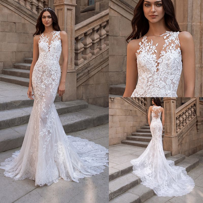 Modest Mermaid Wedding Dresses O Neck Sleeveless Floor Sweep Train