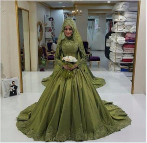 High Neck Muslim Wedding Dress Bridal Gowns Olive Green Long