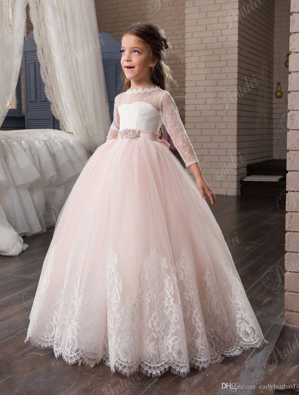 Cute Pink Flower Girl Dresses 3 4 Long Sleeves Lace Appliques