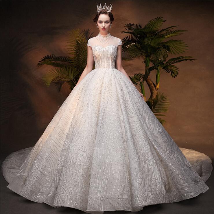 Elegant Luxurious White Stand Collar Crystal Bling Sequin Wedding