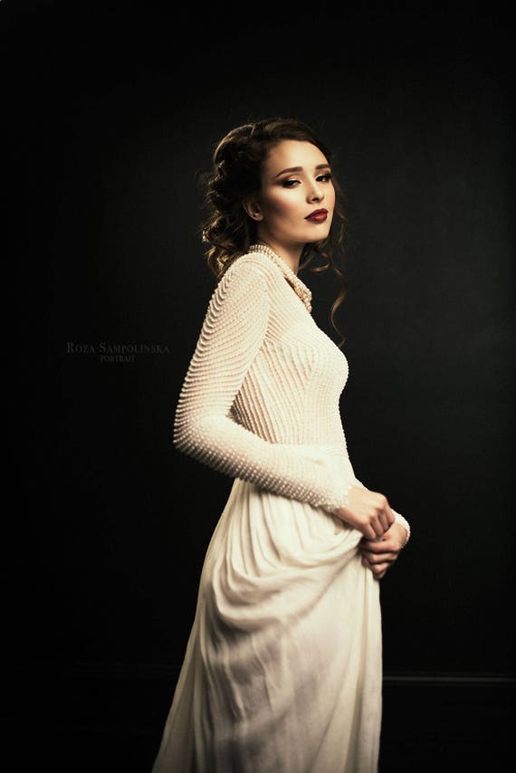 Pearl Hand Beaded Sheer Pearl Lace Silk Chiffon Wedding Gown Etsy