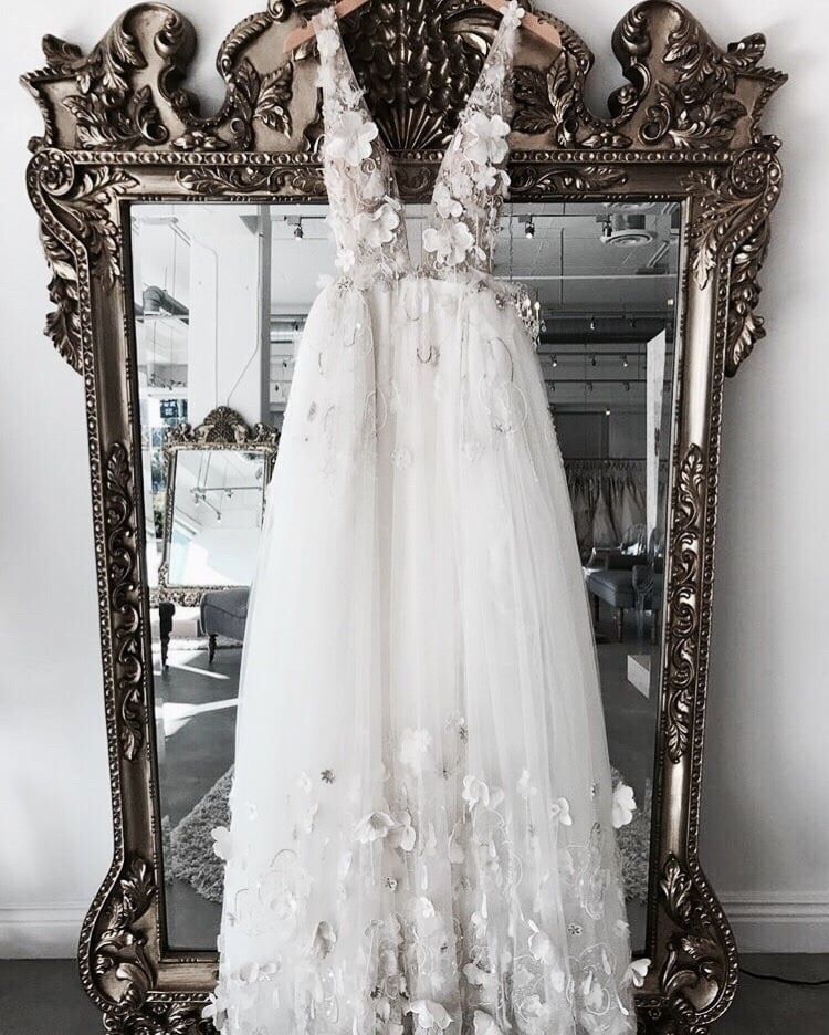3d Floral Embroidered V Neck A Line Wedding Dress With Draped