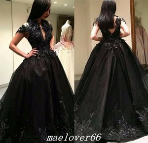 Black Gothic Applique Ball Gown Wedding Dress Backless Cap Sleeve
