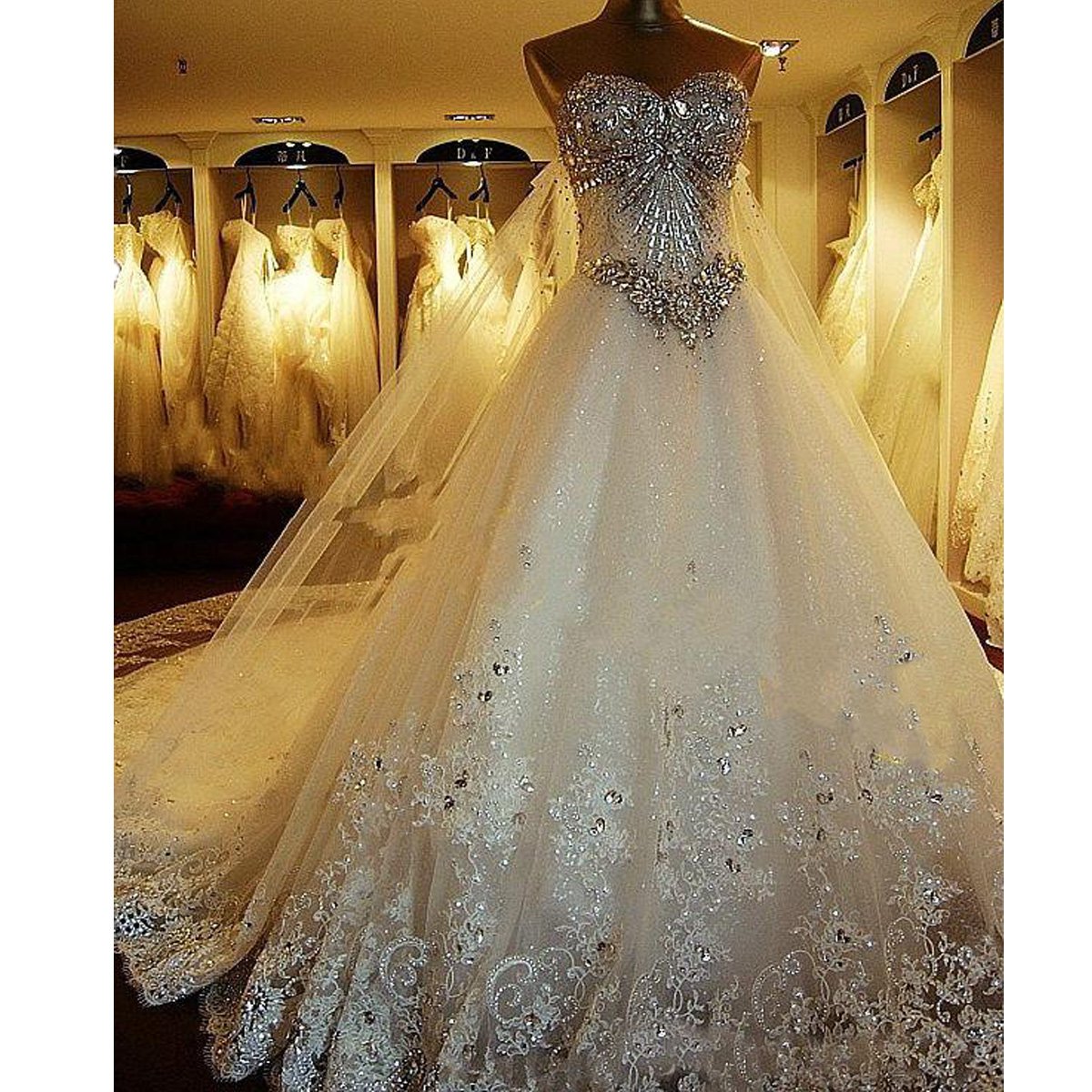 Bepeithy Sexy Sheer Lace Crystal Ball Gown Wedding Dress Casamento