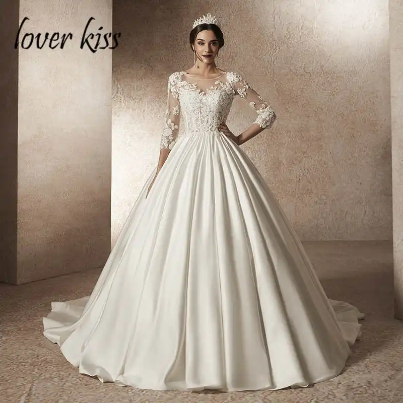 Lover Kiss Vestido De Noiva Retro Satin 3 4 Sleeves Wedding Dress
