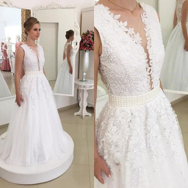 Discount 2020 Glamorous Dramatic A Line Sheer Deep V Neck Lace