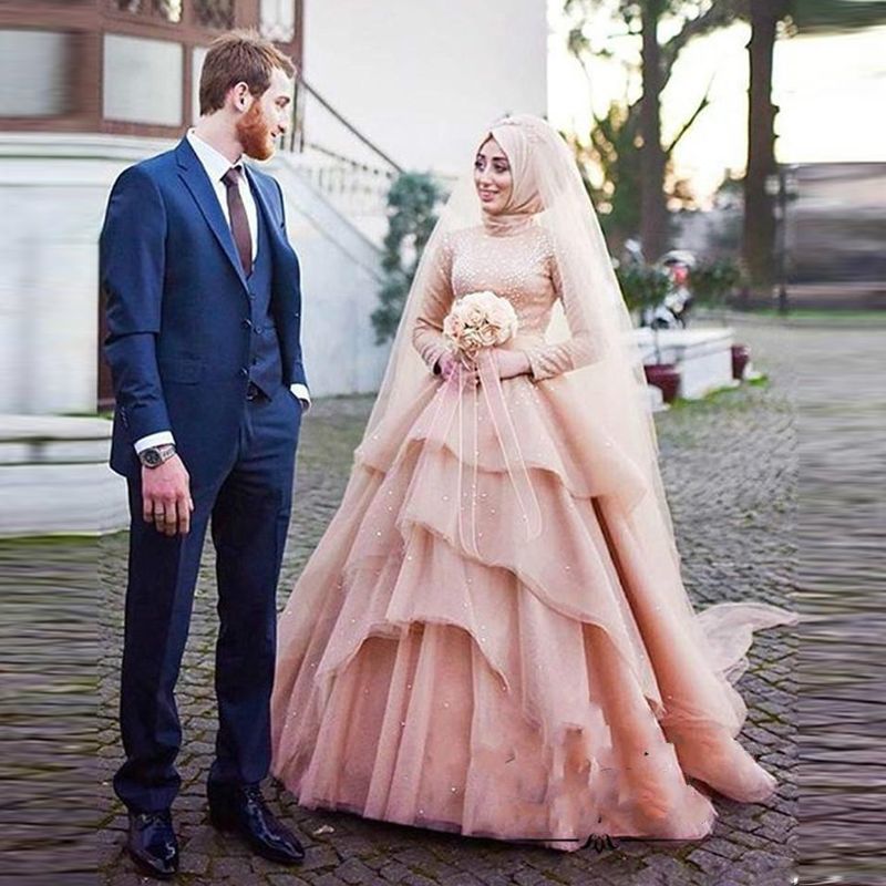 Blush Pink Ball Gown Muslim Wedding Dresses High Collar Long