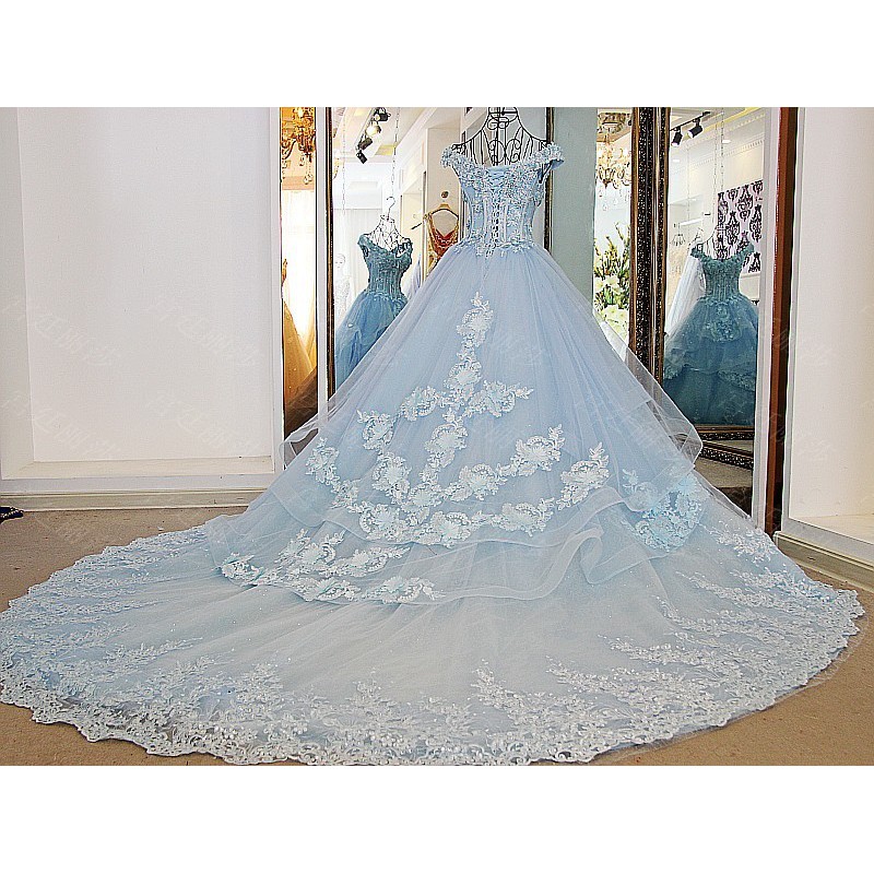 1707044 Biru Putih Ekor Gaun Pengantin Wedding Gown Wedding Dress