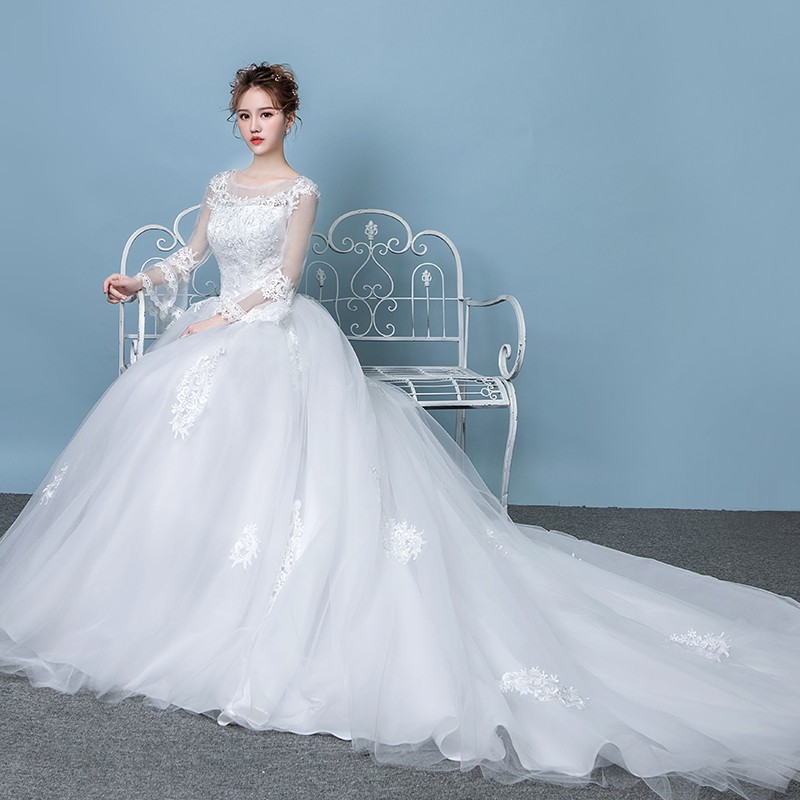 White Long Sleeved Big Long Tail Lace Wedding Dress Bridal Gown