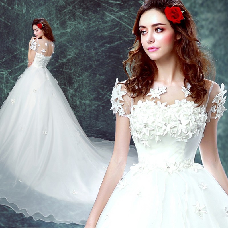 Elegant Lace Flower Short Sleeve Wedding Gown Bridal Dress